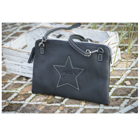 Sac pochette en cuir Flavie dessinée par Pénélope Collections, d'inspiration équestre et pour porter en ville. De forme rectangulaire, il se ferme par une fermeture à glissière sur le dessus rehaussée d'un pompon et son intérieur composé d'une doublure de tissu crème et d'une petite poche zippée. Côté look extérieur, il a une étoile cousue en relief dans lequel on trouve le logo Pénélope embossé. De l'autre côté, il a une sorte de poignée en cuir, elle aussi rehaussée du logo Pénélope embossé, pour un porté à la main original. La pochette-sac Flavie peut aussi se porter à l'épaule ou en bandoulière grâce à sa lanière réglable qui s'attache des côtés du sac.