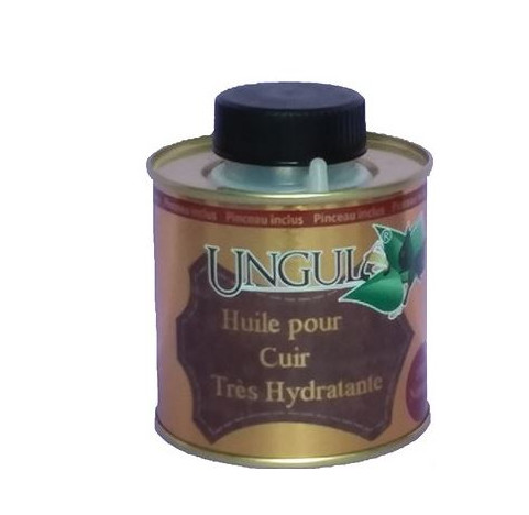 Huile pour Cuir. 100% Naturel. Utilisation :L'huile pour cuir Ungula sert à l'entretien et à la réparation des cuirs : filets, harnachements, selles, protections... Très riche, elle hydrate de façon très importante les cuirs et les nourrit, les assouplit et les imperméabilise. Elle est idéale pour les cuirs neufs. Son pinceau en poil de soie permet une application très facile et très efficace sur les filets et les harnachements. Composition : Deux huiles essentielles. Cire d'abeille. Trois huiles de qualité (dont une huile précieuse). Huile de pied de boeuf. Extraits végétaux. Conseil d'utilisation : Agitez le flacon, égouttez le pinceau sur le bord du pot puis appliquez une très fine couche sur le cuir propre et sec. Le produit n'est pas dilué. Toute sa matière est active. Il ne faut donc surtout pas en appliquer une couche importante. Si le cuir est en mauvais état, il faut effectuer plusieurs applications successives espacées dans le temps. Laissez pénétrer l'huile puis lustrez avec un chiffon doux. Remarque : Il est nécessaire de bien agiter le flacon car nous n'utilisons pas de produits chimiques afin d'obtenir l'homogénéité du produit. Ne convient pas au cuir nubuck, agneau et velours. Ne contient pas d'acide, de solvant ni de résine. Produit d'entretien pour un usage externe.