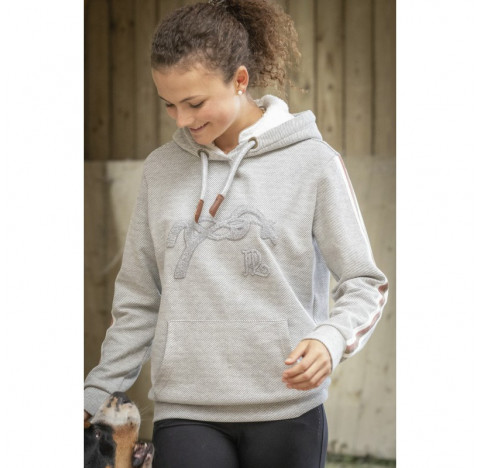 Sweat Pénélope gris clair à capuche. Logo Pénélope à l'avant en gris clair légèrement pailleté, grande poche à l'avant. Le tissu du sweat est parsemé d'une alternance de rayures gris foncées et gris claires.Il y a une bande tricolore sur chaque bras, blanc/rose gold/blanc.La capuche est doublée en polaire blanche, et équipée de cordons de serrage dont le bout est arrêté pars des empiècements en simili cuir.