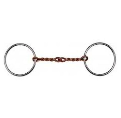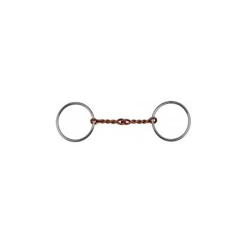 Mors à canons fins torsadés très sévère. Ne s'utilise que sur des chevaux à bouche dure par des cavaliers compétents. Les mors en caoutchouc, cuivre, résine, flexi ou recouverts de cuir peuvent s’abîmer très vite suivant la dentition de votre cheval. Il est conseillé de ne pas utiliser un mors trop abîmé au risque de blesser le cheval et il est primordial de vérifier l’état des barres de votre monture, de sa dentition, ainsi que de son palais. Canons torsadés : 10 mm. Anneaux : 75 mm.