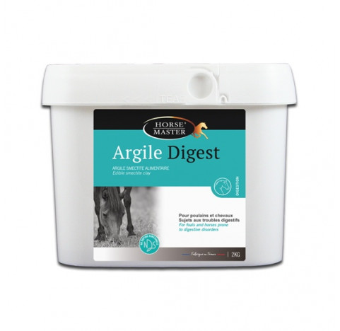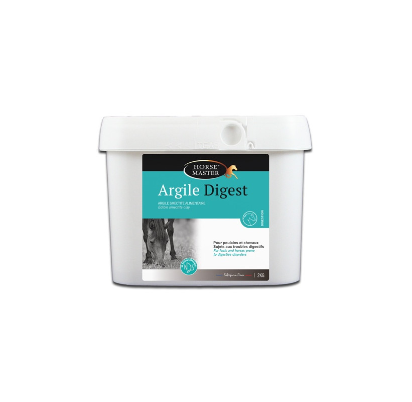 ARGILE DIGEST (2KG) de la marque HORSE MASTER. Poudre argileuse pour les chevaux souffrant de troubles digestifs. L'argile permet d'absorber l'acidité présent dans l'estomac pour un soulagement direct. Produit de type smectite pour absorber acidités et toxines présentes dans le tube digestif. CONSEILS : À donner directement dans la ration en poudre ou dilué dans de l'eau au préalable. Pour un poulain : 15 gr matin et soir pendant 5 à 7 jours. Pour un cheval : 100 gr matin et soir pendant 5 à 7 jours. COMPOSITION : Lithothamme, dextrose.