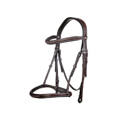 Cuir vachette, parties rembourrées pour la muserolle et la têtièr. Mousquetons couleur argent, longe anglais, frontal doublé, garniture argent. Rênes en bande tissée avec freins en cuir, sans mors, sans noseband.