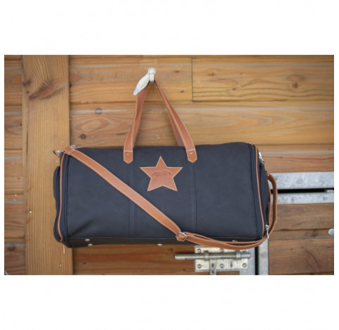 Surprenant par son originalité, le Sac de transport Pénélope Showbag est un sac malin et astucieux !Il faut le regarder sous toutes les coutures pour comprendre à quel point ce sac est pratique et bien pensé.Grâce à 3 zips judicieusement placés, le Sac de transport Pénélope Showbag s'ouvre complètement et se met à plat.Il dévoile alors toutes sa capacité de rangement : 1 grande poche pour ranger soigneusement et à plat la veste de concours sur cintre. 2 petites poches en mesh pour les accessoires (gants, chaussettes, …)à chaque extrémité 1 emplacement pour le casque et les boots d'équitation au centre, 1 espace pour le reste de vos vêtements (pantalon, polo, mini-chaps, …) Le Sac de transport Pénélope Showbag contient tous les emplacements nécessaires pour transporter facilement la tenue complète du cavalier ! Pouvant être porté sur l'épaule ou à la main, il est équipé de 2 poignées et d'une bandoulière réglable en cuir de vachette de couleur cognac. Élégant et sobre, le Sac de transport Pénélope Showbag est décoré d'une étoile estampillée de l'emblématique logo Pénélope.Pour plus de résistance, son fond est renforcé par 6 petits picots en métal. Composition : Tissu principal : 100% polyuréthane Anses et décorations : cuir de vachette. Conseils d'entretien : Nettoyer avec une éponge humide.