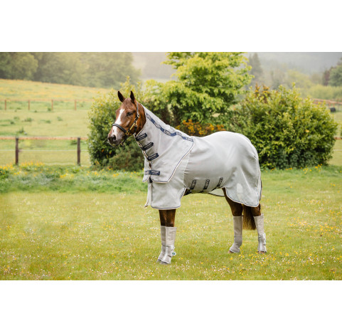 Chemise anti-mouches Rambo Protector conçue dans des matériaux solides et confortables pour garantir à votre cheval une protection optimale durant plusieurs saisons. Une chemise douce et légère pour protéger votre cheval des insectes et des UV pendant la période estivale. La chemise Rambo Protector est fabriquée à partir d'un tissu unique très doux et confortable qui offrira à votre cheval, en plus d'une protection efficace contre les insectes, une protection contre les rayons solaires. Conçue dans des matériaux solides, la chemise anti-mouches Rambo Protector accompagnera votre cheval pendant plusieurs saisons. Une doublure en polyester au niveau des épaules, de la crinière et de la queue protégera votre cheval des frottements. La longueur de la couverture (jusqu'aux genoux) permettra de protége davantage le cheval de l'attaque des insectes. La fermeture de poitrail en V permettra au cheval d'être à l'aise pour brouter et éliminera la pression au niveau des épaules. De plus, cette couverture dispose d'un tissu breveté unique auto-réparant. Couverture vendu en Argent et Bleu. 1. Tissu breveté unique auto-réparant : Résistant et respirant – conçu pour durer. 2. Doublure en polyester au niveau des épaules, de la crinière et de la queue : Pour lustrer le poil et éviter les frottements. 3. Nouvelle forme de couvre cou : Un couvre cou plus près du cheval avec un ajustement amélioré et une meilleure protection au niveau du poitrail. Pour offrir un maximum de protection contre les mouches et les insectes. 4. Plus de longueur pour couvrir jusqu’aux genoux : Pour offrir une meilleure protection. 5. Fermeture poitrail en V : Permet à votre cheval d’être à l’aise pour brouter. Élimine la pression et évite les frottements au niveau des épaules. 6. Découpes Leg Arches : Pour une grande liberté de mouvement. 7. Rabat ventral plus long : Pour envelopper le ventre du cheval pour une protection maximale. 8. Trois sursangles droites : Pour un ajustement sécurisé. 9. Lanière de queue : Maintient la couverture en place. Élimine le besoin de courroies entre les jambes. 10. Rabat de queue très long avec une doublure soyeuse : Évite les frottements et offre une couverture optimale et une protection contre les UV. CARACTERISTIQUES : Protection UV à 65%, une matière solide conçue pour durer plusieurs saisons, large rabat de queue avec doublure soyeuse, découpe leg arches pour plus de liberté de mouvement, protection ventrale, fermeture frontale en V pour plus de confort et de facilité d'utilisation, une doublure au niveau de la crinère et des épaules pour éviter toute irritation, 3 sursangles droites, un couvre cou amovible.