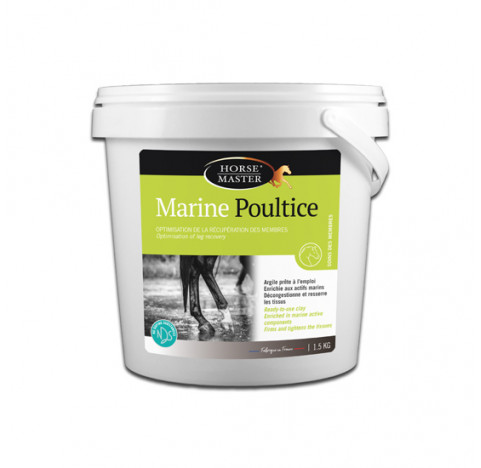 MARINE POULTICE est un emplâtre prêt à l’emploi pour les membres fatigués des chevaux. Cette argile peut également être appliquée sur le dos, l’arrière main et les épaules. MARINE POULTICE est composée de deux argiles (Montmorillonite et Kaolinite) aux propriétés astringentes qui tonifient et resserrent les tissus. Sa formule est enrichie en actifs marins connus pour optimiser la récupération tissulaire grâce à ses propriétés relaxantes. Mélange d’argiles Montmorillonite et Kaolinite actifs marins riches en sels minéraux et oligo-éléments, glycérine. Appliquer une première couche de MARINE POULTICE à rebrousse poil, puis terminer par une seconde couche en lissant dans le sens du poil. Laisser poser minimum 6 h et nettoyer à l’eau claire ou au shampoing.