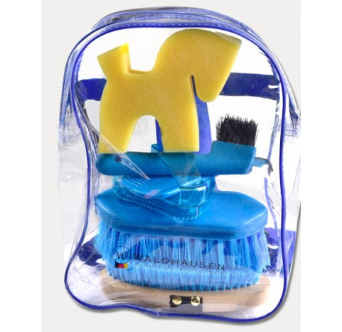 Kit de pansage pour petits et grands passionnés. Brosse de pansage, brosse à chien-dent, peigne pour crinière, cure-pied, éponge cheval. Livré dans un sac à dos transparent.