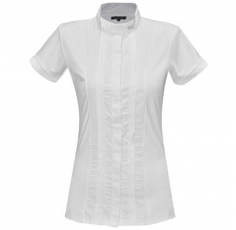 Polo d’équitation bi-matière, alliez l’élégance et le confort pour vos concours. L’élégance d’une chemise de concours raffinée avec son plastron plissé intégral. Le confort d’un polo technique souple, léger, confortable et respirant. Patte de boutonnière boutons cachés. Bord des manches côtelés. Broderie F&C argentée sur le col (à fermeture magnétique). Composition : plastron : 60% coton, 38% polyamide, 2% popline élastique. corps : 95% polyester, 5% jersey élastique.
