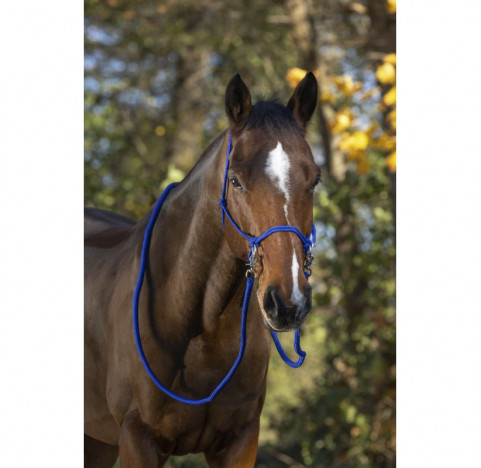 Pré-noué en polypropylène équipé de 2 anneaux en acier chromé sur la muserolle pour fixer les rênes. Vendu avec une paire de rênes d’une longueur totale de 3 m, amovible par mousquetons mexicains tournants en zinc chromé.