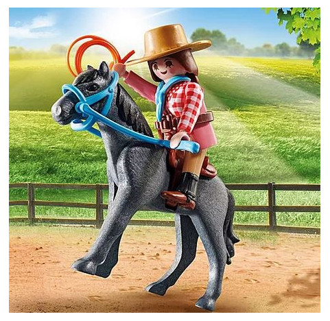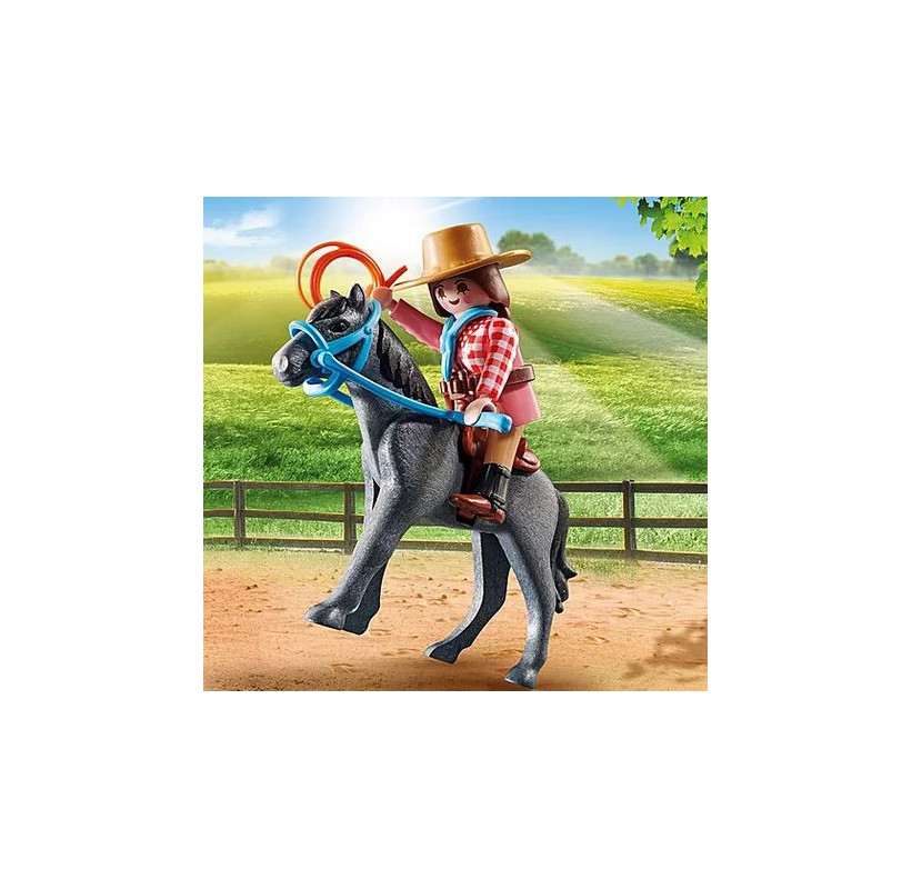 Description : Cette cavalière monte à cheval comme personne, elle et son cheval sont très complices !Contient un personnage et un cheval.