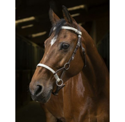 Side-pull en cuir de buffle. Frontal et muserolle souples en cuir tressé. Boucle en inox.