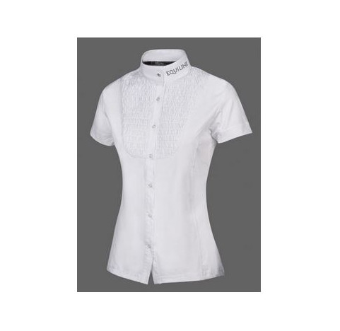 Chemise de Concours Femme Becka manches courtes Equiline : Chemise originale et élégante de concours manches courtes. Une superbe composition de matières et de style. Col blanc avec logo equilin en strass sur le col.Bouton de haut en bas. Une coupe légèrement cintrée pour une superbe chemise. Matières : 82% polyamide, 18% élasthane.